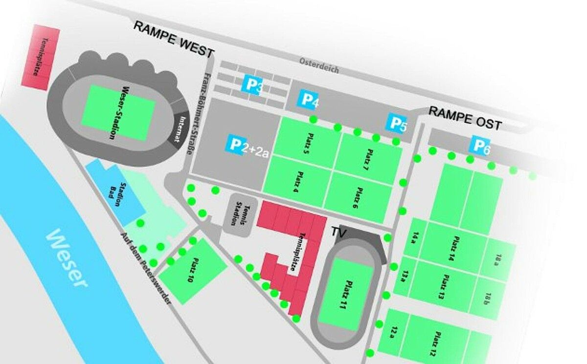 (Hansalinie) aus dem Norden oder aus dem Süden bis Abfahrt 55 Bremen-Hemelingen, weiter in Richtung City der Ausschilderung Weserstadion folgen. Platz 11 liegt unmittelbar am Weserstadion und ist ausgeschildert.