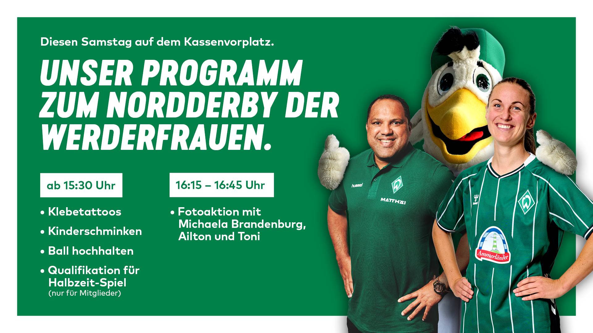 Ein weiteres Highlight ist die Foto-Aktion mit WERDERFRAUEN-Spielerin Michaela Brandenburg, die von 16.15 bis 16.45 Uhr gemeinsam mit Möwe Toni und Ailton an der Holzhütte unseres Partners AB InBev für Fotos mit Werder-Fans zur Verfügung steht – eine tolle Gelegenheit für ein persönliches Andenken an diesen besonderen Werder-Tag.