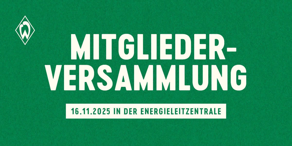 Die diesjährige Mitgliederversammlung des Sport-Verein „Werder“ von 1899 e. V. findet am Sonntag, 16.11.2025, ab 11.00 Uhr in der ENERGIELEITZENTRALE (Am Speicher XI 11, 28217 Bremen) statt. Auf der Tagesordnung stehen unter anderem Wahlen für den Aufsichtsrat und den Ehrenrat.