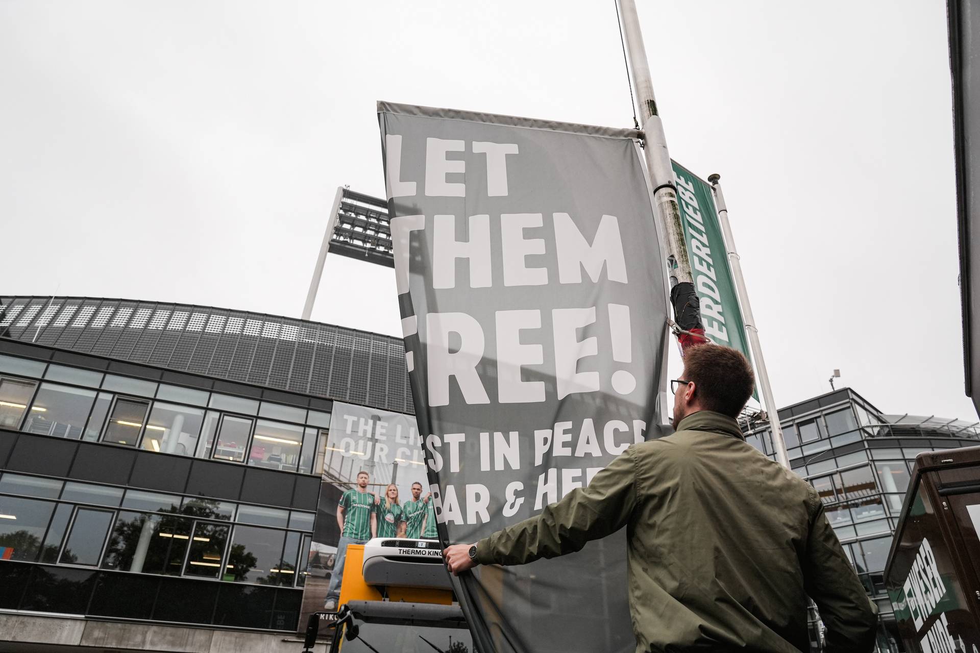 Gestern wurden nach mehr als zwei Jahren endlich die letzten noch gefangenen, lebenden Geiseln aus der Gewalt der Hamas entlassen. Für ihre Angehörigen und viele weitere ist dies ein riesiger Moment der Erleichterung. Wir freuen uns mit allen, die so lange auf diesen Moment gewartet haben und sind erleichtert, die #Letthemfree-Fahne vor dem Weserstadion endlich abhängen zu können.